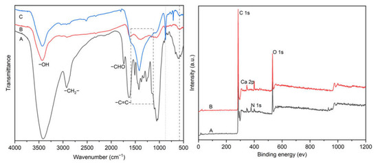 FTIR spectra (Left) of peanut shells (A), PSB (B), and Ca-PSB2 (C); XPS spectra (Right) of PSB (A) Ca-PSB2 (B).