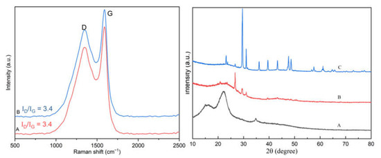 Raman spectra (Left) of PSB (A) and Ca-PSB2 (B); XRD spectra (Right) of peanut shells (A), PSB (B), and Ca-PSB2 (C).