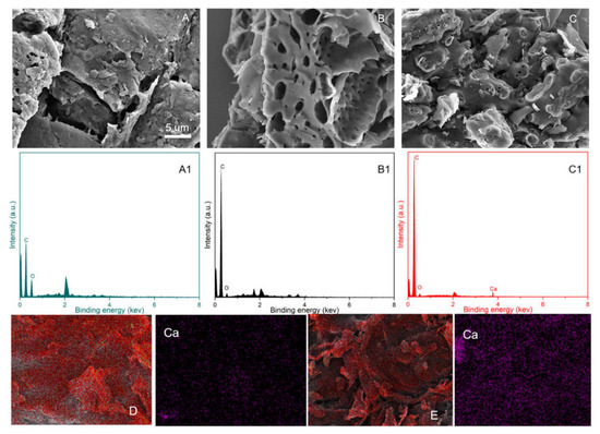 SEM images of peanut shells (A), PSB (B), and Ca-PSB2 (C); EDX spectra of peanut shells (A1), PSB (B1), and Ca-PSB (C1); and EDX mapping analysis of PSB (D), and Ca-PSB2 (E).
