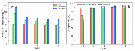 With the number of adsorption-desorption recycling increasing, the P adsorption capacity of biochar showed a downward trend (Figure 7). However, the ability to adsorb P of the different adsorbents showed different downward trends. (Figure 7). For the PSB, there was no significant difference in the P desorption rate, which varies between 93.3% and 96.3%. For the Ca-PSB1 and Ca-PSB2, the P desorption rate was 85.4% and 78.4%, respectively. This result can be attributed to the formation of precipitate between Ca ion and some phosphate. However, the P desorption rate of the Ca-PSB1 was 93.4%, 94.6%, 94.5%, and 94.5% for 2nd, 3rd, 4th, and 5th cycle, and the desorption rate for the Ca-PSB2 was 94.6%, 95.9%, 96.6%, and 97.2%. The adsorption efficiency for the Ca-PSB1 and Ca-PSB2 was reduced by 37.7% and 32.6% after five cycles, this may be attributed to the accumulative loss of Ca ion in the adsorption and desorption process. However, the adsorption capacity of the Ca-PSB2 was still higher than that of the PSB and Ca-PSB1 after five cycles, due to the abundant pore structure.
