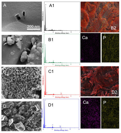 SEM images (left row) and EDX spectra (middle row) of PSB before P adsorption (A,A1), PSB after P adsorption (B,B1), Ca-PSB2 before P adsorption (C,C1), and Ca-PSB2 after P adsorption (D,D1); EDX mapping analysis (right row) of PSB (B2), and Ca-PSB2 (D2) after P adsorption.