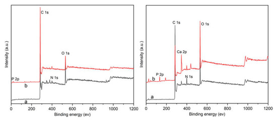 XPS spectra of PSB (Left) and Ca-PSB2 (Right): (a) before P adsorption and (b) after P adsorption.