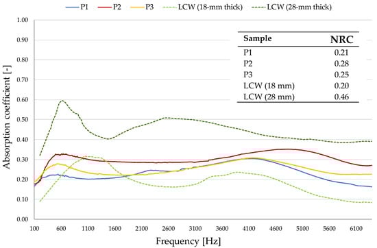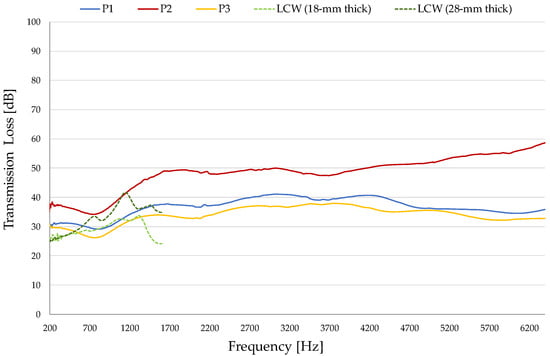 The two trends are overlapped at frequencies greater than 2000 Hz, whereas P3 has α-values higher than P2 over 4500 Hz. The sound insulation performance of P3 panel is of the same magnitude of P1. In fact, despite TL = 30–41 dB for P1 and TL = 30–38 dB for P3, the mean thick value of the panel with natural glue (P3, equal about 17 mm) is lower, involving a decrease in Transmission Loss, according to the literature [31]. Considering the results obtained in the previous study [25], an increase of NRC in the 5–30% range is obtained with respect to the 18 mm thick panel. In the 200–1600 Hz range, transmission loss levels are significant: for the P2 board, they also exceed the values measured for the 28 mm LCW panel with higher-size leather pieces (TL = 25–42 dB) [25]. The obtained acoustic absorption properties are consistent with those of mineral and natural fiber-based panels (NRC = 0.20–0.31) with similar thicknesses (16–20 mm), and with NRC value of 17 mm granulated rubber board characterized also by similar texture and density. Conversely, less thick panels (10 mm) of coffee chaff and glued wastepaper perform better [25]. Glued wood fiber has a similar NRC value (0.25), but for much higher panel thickness (30 mm) [27,34,35].