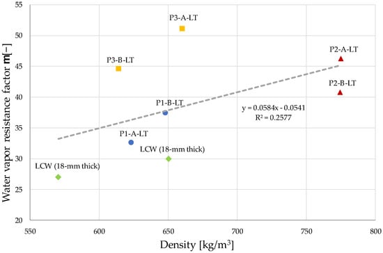 The water vapor resistance factor µ of each sample was calculated when the permeability test stability was achieved (8–21 days from the beginning of the experimental campaign), according to the standard prescriptions [33]. For calculation, a water vapor permeability of air equal to 2.05 × 10−10 kg/(msPa), with a measured barometric pressure at 23 °C inside the apparatus of 985 hPa and a water vapor pressure difference across the sample equal to 1404 Pa were assumed. G-values in the 2.88–3.16 × 10−9 range were calculated and mean µ-values of 35, 44, and 48 were obtained for the P1, P2, and P3 panels, respectively (Table 4). Water-based glue involves an increase of about 37% in the permeability performance. Higher water vapor resistance values were obtained with increasing density for all mixtures (Figure 5). For P1 and P3 panels, µ increases by about 15% as the density rises by 4–7%, respectively. Furthermore, resistance value increases of about 13% for boards with the addition of the infustiture (P2-A and P2-B) were characterized by similar density values (775.2 and 774.6 kg/m3 respectively). Water vapor resistance of the material is improved when the leather cutting wastes are smaller; lower µ-values (in the 27–30 range for 18 mm boards with density equal to 570 and 650 kg/m3, respectively) were obtained in the previous study [25]. Permeability performance is close to that of conventional insulating materials, such as the expanded polystyrene (µ = 20–80) and polyurethane (µ = 30–100). Conversely, the panels had higher moisture transfer properties with respect to many traditional fibers (i.e., wood (µ = 3–10), cork (µ = 5–10), hemp, corn, and coir (µ = 1–3), expanded vermiculite and perlite (µ = 5–8), glass and stone wool (µ = 1–5), sheep wool (µ = 3), and glued waste and wool paper (µ = 2–4)) [25,39].