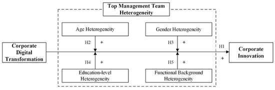 Based on the above analysis, a theoretical model of the impacts of digital transformation on corporate innovation is presented in Figure 1. The basic model’s constructs are digital transformation, corporate innovation, age heterogeneity of TMT, gender heterogeneity of TMT, education level heterogeneity of TMT, and functional background heterogeneity of TMT. The relationships among these variables are shown clearly in the model.