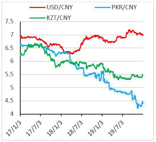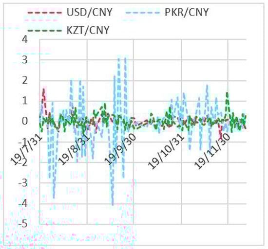 Figure 1. As can be seen from the figure, the exchange rate fluctuation of the US dollar against Chinese currency is relatively stable with little fluctuation; the daily exchange rate fluctuation of the Kazakhstan tenge against Chinese currency is moderate; and the daily exchange rate fluctuation of the PKR against Chinese currency is large, with a maximum daily fluctuation range of −4.12%. The recent three-year exchange rate trend of the three currencies against Chinese currency is shown in