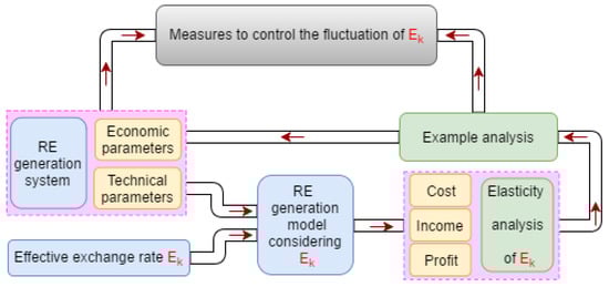 This paper deduces the main factors of RE’s foreign investment subject to exchange rate fluctuations. The concept of real exchange rate in RE foreign investment projects was proposed, the elasticity formula of cost, income, and income of power generation projects to real exchange rate was derived, and the RE foreign investment income model was constructed. Taking China’s investment in Pakistan wind power project as an example, we calculated the economic risks brought by exchange rate fluctuations to the project, and gave the range of exchange rate fluctuations that the project can withstand. Three effective measures to deal with the risk of exchange rate fluctuation for RE power generation projects invested abroad were given: the first measure reduces the project cost and raises yields, hedging the economic risk caused by exchange rate fluctuations with profits. The second measure builds an energy accommodation and allocation Internet, offsetting the economic risks caused by exchange rate fluctuations because the exchange rate fluctuations between currencies vary in size and direction in different periods. The third measure uses Chinese currency as the settlement currency to avoid exchange rate fluctuations and reduces the risk factors of RE power generation projects.