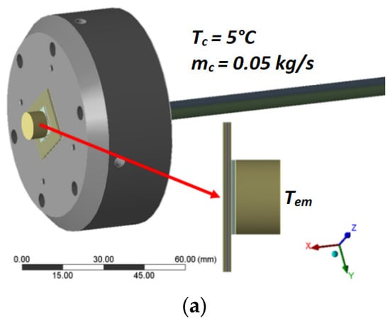 The original 3D CAD design of the TIPV converter, including the copper plate heat spreader and the DMS, along with its active cooling system containing water as a coolant with a mean temperature of Tc = 5 °C and a mass flow rate of mc = 0.05 kg/s, is depicted in Figure 3a. In order to save computational costs, since the construction of the domain near the microspacers requires a high amount of cells, a simplified geometry is studied comprising only the cathode, the microspacers and the PV anode, as seen in Figure 3b. At the rear side of the anode close to the cooling system, an appropriate boundary condition is considered to take into account the heat collection by means of the cooling system. Such a simplification of the geometry is mainly implemented because the purpose of this analysis is to test the effect of the different DMS patterns on the total anode temperature, whereas simulation of the cooling system and optimization of its design were already completed in [8].