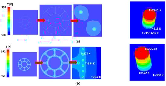 By applying Model B, which takes into account the radiation and thermionic emission between anode/cathode, it can be seen that Patterns 1–4 exhibit a quite similar thermal behavior with regard to the anode’s upper part temperature, thus, almost converging in terms of temperature results (Figure 9a). Some small differences are traced near the DMS/anode interface, with the worst cases being Patterns 3 and 4 due to their higher DMS diameter compared to Patterns 1 and 2 (Figure 9b).