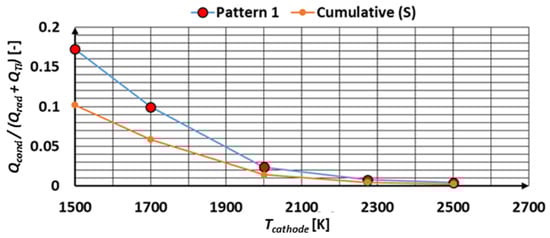 Figure 11 provides a comparison of the area-weighted average temperature of the anode upper part between the ring shape and cumulative surface area arrangements. Once more, it is proven that Pattern 1 and the cumulative arrangement with the same surface coverage have virtually the same results with regard to the anode temperature. The highest effect in the anode temperature occurs when the anode surface coverage from the microspacers is equal to or higher than 5% (Pattern 9—Cumulative 1000 S). This is attributed to the fact that as the surface coverage increases, the ratio of heat conduction to radiative/thermionic flux increases, as seen in Figure 12. This ratio is more important for lower temperatures, i.e., <2000 K and is not so important when moving to ultra-high temperatures, where the radiative heat flux and the flux due to thermionic emission are considerably high.
