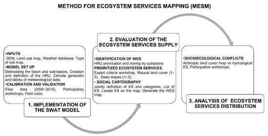 The study was developed using the Method for Ecosystem Services Mapping (MESM) described in Figure 2. A proposed methodology based on mixed methods research which included (i) implementation of the SWAT hydrological model, based on updated cartographic inputs (ii) evaluation of ecosystem services (ES) supply complemented with social cartography to locate WES, and the (iii) analysis of ES distribution, to understand the socio-ecological conflicts that limit the availability of WES for the LPR communities.