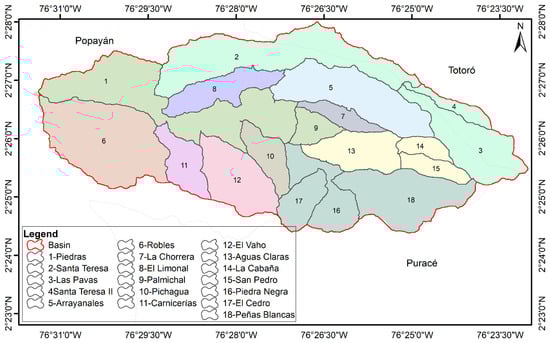The LPRB delimitation was updated with a total area of 6606.27 ha, approximately 20 ha less than the one reported by [26], due to the precision of the DEM used in the study, from 30 m to 12.5 m. Based on this, 18 sub-basins were identified in the LPRB, compared to 13 reported by [33], regarding to this, the Robles sub-basin is included (6), the Santa Teresa sub-basin is divided into Santa Teresa (2), Las Pavas (3) and Santa Teresa II (4), the Aguas Claras sub-basin is divided into Aguas Claras (13), La Cabaña (14) and San Pedro (15) And the Buena Vista sub-basin is divided into the El Cedro (17), Peñas Blancas (18) and Piedra Negra (16), as shown in Figure 3 for details and comparisons.