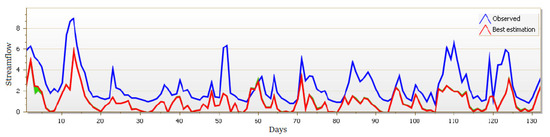 The values of the determination coefficient were R2 = 0.99 for ARR and R2 = 1 for DIV. Water quality data were not considered in the calibration because these do not complement the minimum historical data, however, satisfactory calibration was obtained with R2 = 0.614 [34] for monthly streamflow data (Figure 4), Table 1 shows the calibrated values for the parameters of interest.