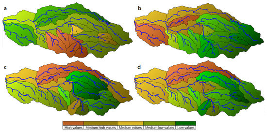 A 607 HRUs map of the LPRB was prioritized (from an initial 1687 HRU map) by a minimum percentage of aggregation considering representative land use, soils, and slopes of the zone, covering 100% of the basin modeled with the best distribution in the 18 sub-basins [27], from this output. The actual condition of the LPRB was modelled made at sub-basins level; the results are shown in Figure 5.
