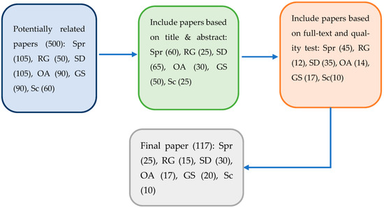 The objective of this work is to review the main effects of sodium salinity on O. sativa. For the design and strategy of the information search, a methodology for literature review and information management of scientific topics was used, through its structuring and systematization, to compile and summarize the existing studies on the effects of sodium salinity on rice cultivation [33]. Using the keywords “sodium salinity” “rice” “sodium stress” “sodium chloride stress” “NaCl salinity” “NaCl stress” “NaCl-induced salinity” “NaCl salinity stress” “NaCl salinity stress” “sodium chloride-induced changes” in databases recognized by the scientific community, such as Springer (Spr), ResearchGate (RG), Sciencedirect (SD), Oxford Academic (OA), Google Scholar (GS) and Scielo (Sc). Publications of scientific articles in the international, regional and national contexts were analyzed. The bibliographic references of the selected articles were researched to recover other studies that could potentially be included in the review, which yielded a volume of information of 500 documents (Figure 1).