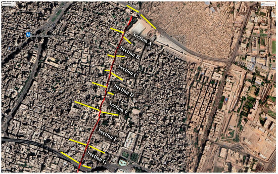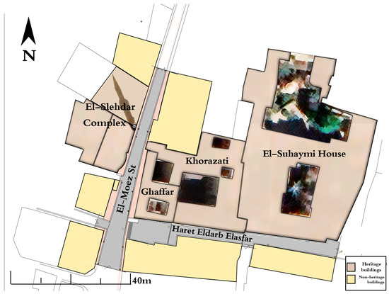 The research selected and divided the northern part of El-Moez St. into seven sections according to the intersecting arteries and the number of monuments in each section (Figure 2). Then, it selected section C as a case study, including three monuments and one heritage building: three houses (Mostafaa Ghaffar, Khorazati, and El-Suhaymi) and one multi-use religious complex (the Mosque and Sabil of El-Slehdar). Section C has one of the most valuable alleys in historic Cairo, named “Hart El-darb El-asfar” (Figure 3).