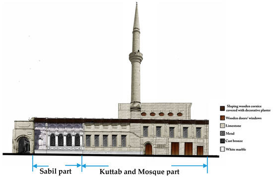 The façade of the sabil consists of four round-arched windows, each covered with cast bronze and hollowed-out ornaments. This part of the façade is covered with white marble carved with floral ornaments and inscriptions. The kuttab and mosque’s façade consists of ten rectangular windows: Half on the ground floor and the other five on the first floor. They are all covered with metal hollowed-out ornaments. This part of the façade is covered with limestone. A sloping wooden cornice tops the whole façade, including its two parts covered with decorative plaster (Figure 4, Figure 5 and Figure 6). The Ottoman minaret is covered with limestone [14].
