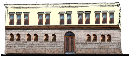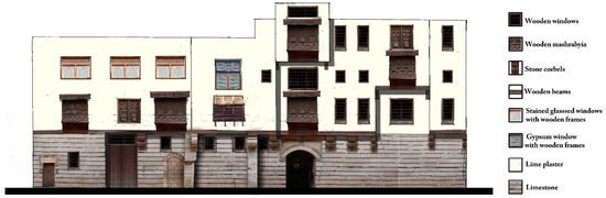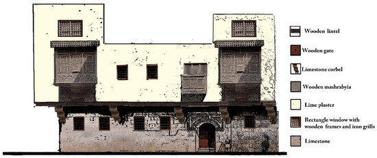 The ground floor of the house’s façades is covered by limestone, and the remaining parts of the façades are covered by lime plaster. The façades of the house have limestone corbels and wooden lintel that bear the prominent part of the facades of the house [15] (Figure 7, Figure 8 and Figure 9).