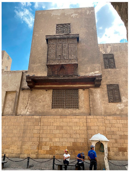 The architectural style of the external façade of El- Suhaymi house is characterized by Islamic architectural elements. It consists of eight mashrabyia windows with three different forms, rectangle windows with wooden frames, and iron grilles of different sizes. The effect of Ottoman Islamic architecture can be observed in this façade by the two stained glassed windows and single gypsum windows with wooden frames. Like the other two heritage houses of Eldarb Elasfar street, the ground floor of the façade of El-Suhaymi House is covered with limestone, and the remaining parts of the façade are covered with lime plaster. The façade has limestone corbels and wooden ones in the upper parts of the façade. There are wooden lintels that bear the prominent parts of the house’s façade [18] (Figure 12, Figure 13 and Figure 14).