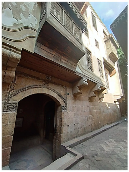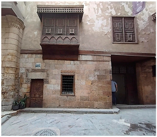 The architectural style of the house merged the styles of 19th-century Cairo and Turkish houses. The house consists of two stories. It has one façade that overlooks Eldarb Elasfar st., and the façade of the ground floor has ten wooden pointed arched windows covered with iron grilles and a stone round arched house gate with wooden doors. The first floor façade has 12 rectangular wooden framed windows with wooden-glassed panes (Figure 10 and Figure 11).