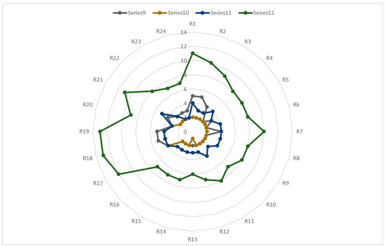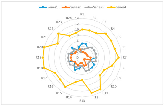 Multi rounds of discussions were held with experts on-site to rate the risks that may happen to the architectural elements materials, as shown in Table 5. Ten experts, including conservators and conservation architects with 20+ years of experience, were asked to rate risks. Everyone rated the risks for the four selected cases according to the three elements A, B, and C. Then, the researchers calculated the median to express one value per each element, as shown in Table 5 and Figure 15, Figure 16, Figure 17 and Figure 18. The analysis revealed the risk magnitude rates. It showed the positive risks (with low negative or no effect on the elements, such as the effect of low rainfall that can clean the element of dust) using green and blue colors, and the negative risks (with great negative effects on the elements causing deterioration), using the orange, yellow, and red colors, carried out for the four selected buildings. Every building represented one unit in the coming simulation of Tornado sensitivity analysis.