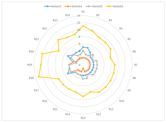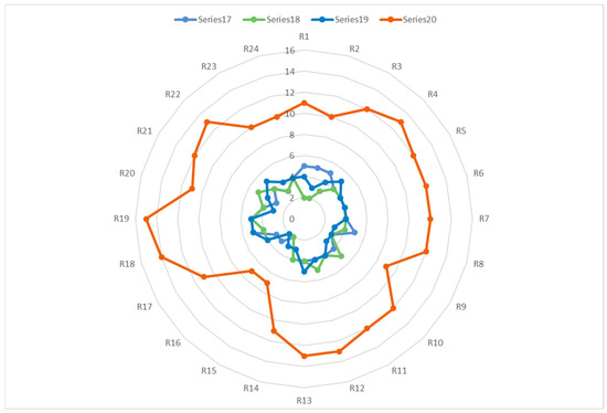 This tornado sensitivity analysis simulation was made using the resulting numbers from the previous quantitative analysis of the ABC method to determine risks with the most potential impact on the heritage buildings’ facades for the four selected cases to compare the relative importance and impact of variables with a high degree of uncertainty to those that are more stable, depending on the set of ranged colors concerning the positive and negative risks from "blue, green, yellow, orange, and red" shown in Table 5. This analysis highlighted possible benefits which could be achieved by positive risks. For risks that could be greater than the corresponding identified negative impacts, see Figure 19, which shows the tornado simulation for the risks of the four selected cases in section C of El-Moez street in historic Cairo.