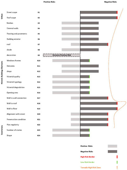 A prioritized list of quantified risks was produced from the previous two analysis methods. This list included those risks as the greatest threat or greatest opportunity concerning the heritage buildings’ façades state of conservation.