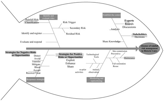 One of the common techniques in management is the A cause-and-effect model to solve problems. It uses a fishbone diagram that introduces the risk framework, which is advised for use in historic Cairo rainfall risk assessment increase resulting from climate change impacts (Figure 20).