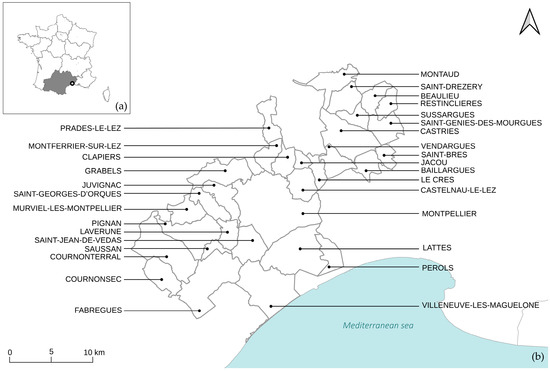 (a) Location of Montpellier Méditerranée Metropolitan area in France; (b) 31 municipalities of Montpellier Méditerranée Metropolitan area.
