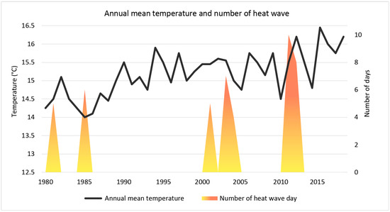 Annual mean temperature and number of heat wave days (temperature 5 °C higher than normal for at least 5 consecutive days) from 1980 to 2018.