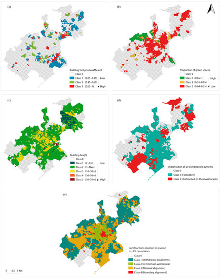 (a) Building footprint coefficient; (b) proportion of green spaces; (c) building height; (d) implantation of air-conditioning systems; (e) construction’s location to plot boundaries.