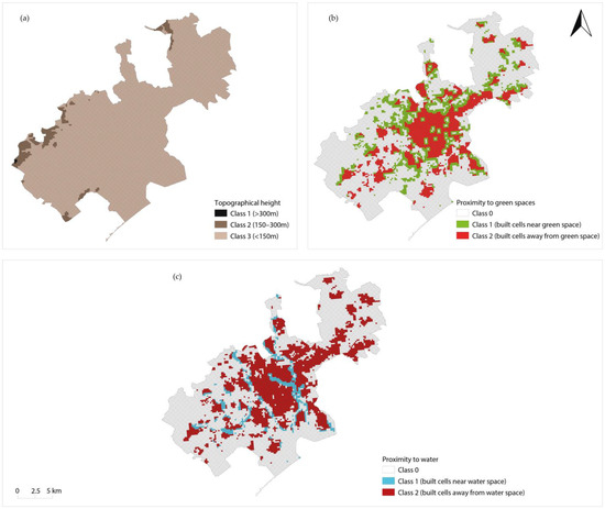 (a) Topographical map; (b) proximity to green spaces; (c) proximity to water spaces.