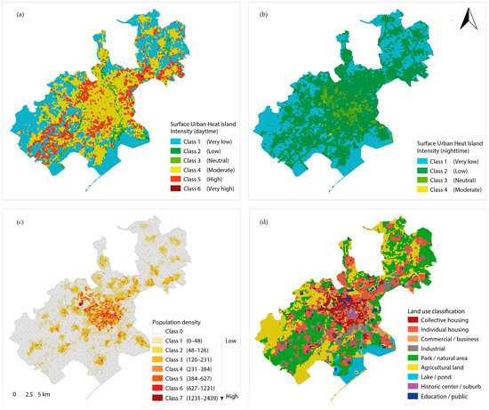(a) SUHI intensity (daytime); (b) SUHI intensity (nighttime); (c) population density; (d) land use classification.