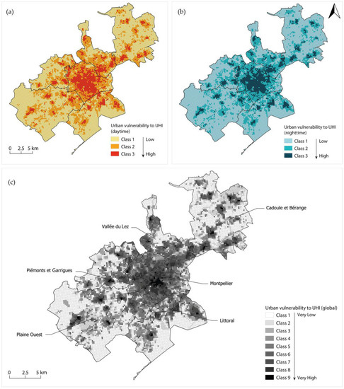 The vulnerability to UHI effects is analyzed with regards to the selected drivers set. These fifteen input parameters are related to urban planning policies, exposure and sensitivity to urban overheating. The final map of urban vulnerability to UHI effects is generated at the Montpellier metropolitan area scale based on a geographic cross-check of the different scores assigned to each cell. The daytime, nighttime and global vulnerability maps reflect the climatic issues and challenges facing the Montpellier metropolitan area (Figure 8). The analysis of the spatial variations of the vulnerability intensity during the day, at night and globally is carried out according to the number of cells, the associated surface area and the most affected areas of the territory.