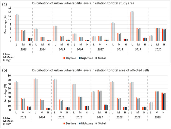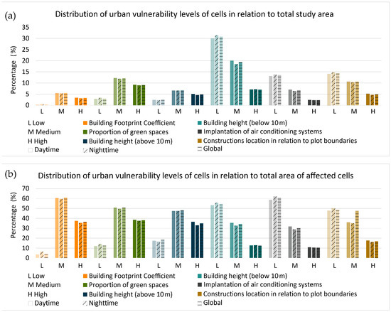 (a) Distribution of urban vulnerability levels of cells affected by medium-to-high classes of “urban planning policies” indicators to total study area; (b) Distribution of urban vulnerability levels of cells affected by medium-to-high classes of “urban planning policies” indicators to the total area of affected cells.