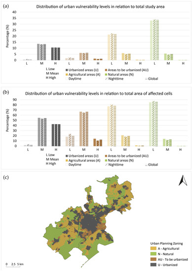 The UHI vulnerability is analyzed according to the zoning of Local Urban Plans (Figure 10). Local Urban Plans are composed, as well as urban regulation, of urban zoning on which the regulation is applied. Zoning plans are cartographic documents representing a sectoral division of each territory [50]. They are composed of four types of zones which have specific land uses: urbanized zones (U); areas to be urbanized (AU); natural areas (N) and agricultural areas (A). Actually, U and AU zones account for 32% of the entire territory compared to A and N zones, which represent 67.3%. The results exhibit that 93.6% (daytime), 90.9% (nighttime) and 92.6% (global) of these zones, which refer to areas where urbanization is likely to occur, are affected by medium-to-high vulnerability. Their total area accounts for more than 3500 cells and 13,000 ha. However, 22.5%, 19.3% and 21% of medium-to-high vulnerability cells during daytime, nighttime and globally, respectively, are located in agricultural areas. Moreover, only 14.6% (daytime), 12.4% (nighttime) and 13.5% (global) of natural areas are affected by medium-to-high vulnerability levels. The total amount of these affected cells is 5200 ha during the day, 4400 ha at night and 4800 ha globally.