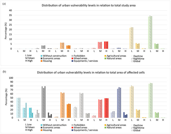 The results of the vulnerability assessment according to land use type are shown in Figure 11. Actually, authorized land use within each zone is regulated by the Local Urban Plan through the two articles, 1 and 2 [50]. These articles define the type of permitted use: economic activities, housing, mixed zones, services and equipment, agricultural, natural, without construction or prohibited. The analysis of their vulnerability highlights that the areas that can accommodate housing (housing + mixed areas) amount approximately to 24% of the territory’s cells. The results indicate that 96.2% (daytime), 95.2% (nighttime) and 95.9% (global) of these areas are affected by medium-to-high vulnerability. Their total area accounts for more than 10,000 ha of the territory. Areas that can accommodate activities and employment represent 20.3% of the territory. Indeed, the results show that 93.9% (daytime), 90.3% (nighttime) and 92.4% (global) of these areas are affected by medium-to-high vulnerability, which corresponds to more than 8500 ha. In addition to that, Figure 11 shows that slight variation in medium and high vulnerability between daytime and nighttime is observed.
