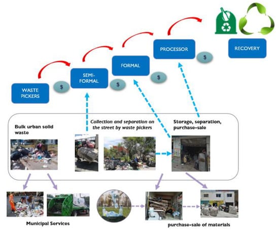 It shows the value chain of materials that are useful for another process and considered raw materials. The waste pickers reseparate the higher quality materials, package, transport, and sell them. In addition, the waste dealer collects a quantity of recoverable waste to sell to industries. These actions generate economic resources, give another use, and prevent these materials from reaching the landfill (Figure 2).