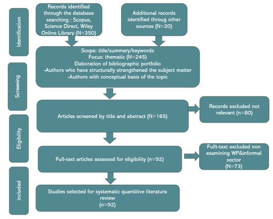The information was obtained by searching and consulting bibliographic references from electronic resources in catalogs, library repositories, and theses about informal urban solid waste collection in cities. The keywords were urban metabolism, informal collection, sustainable cities, recycling, informal collectors, eco-businesses, ‘scrap dealers,’ ‘scavengers,’ ‘scavengers,’ and valorization of urban solid waste (VUSW). In addition to using the Boolean operators AND/OR/NOT and their combinations and inverted commas. Using metadata for advanced searches, information on informal or grassroots waste picker networks was in the different countries where they are established. Eight low-income countries were selected for this research since they offer electronic information and have a more significant presence of informal recycling organizations with or without waste pickers. In the search for an important topic are organizations of informal waste pickers or waste pickers, thus focusing on informal waste picking as an invisible, unrecognized, unimportant, undervalued, and clandestine activity in the absence of social, governmental, and economic inclusion. The initial search was carried out for the 20 most prominent Latin American countries, and the results were narrowed down to the countries with the highest representation in terms of organization, conditions of inclusion or inclusion pathways, and evidence of work in the last 15 to 20 years (so far in the 21st century). Detailed information on Argentina, Brazil, Chile, Colombia, Costa Rica, Ecuador, Mexico, and Peru is presented. Of these approximately 370 articles, the literature was refined and analyzed to meet the objectives of this systematic review [,,,]. The model is used in the SRL method, which is divided into four sections: planning (purpose of the literature review and protocol and training), selection (searching for literature and practical screening), extraction (data extraction and quality appraisal), and execution (synthesis of studies and writing the review). In addition, the data search and selection diagram based on the PRISMA Statement steps was elaborated (Scheme 1).