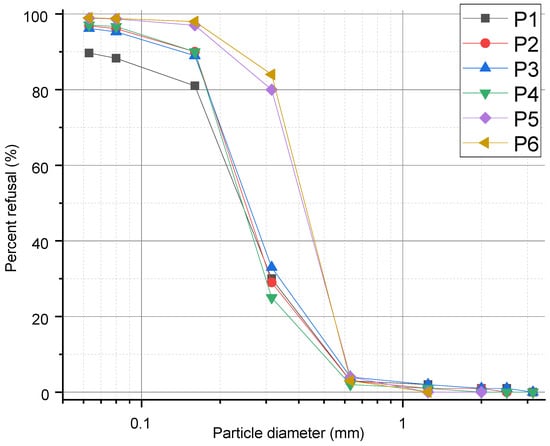 between 0.6 and 2.1). The finesses modulus of samples P1, P2, P3 and P4 is included between 0.6 and 2.1; they are considered as fine-grained sands. Samples P5 and P6 correspond to sand of medium to fine grains (