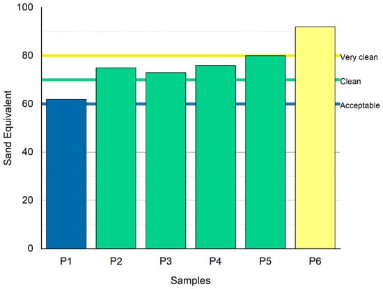SE < 80), with a low percentage of clayey fines, sand perfectly suitable for high-quality concrete. Sample P6 was very clean (