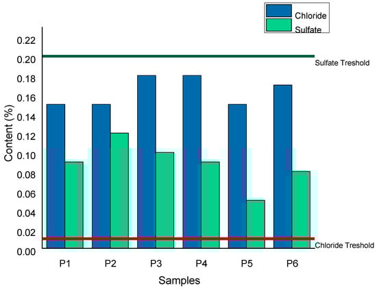 Figure 6 shows the test results and their comparison with the accepted threshold values for the aggregates according to the standard XP P18-545. The chloride content varied between 0.15% and 0.18%. For all samples, chloride content was high; it exceeded the reference threshold. The high chloride content was justified by the marine origin of the sediments; seawater contains dissolved substances, i.e., salts consisting of ions, mainly halide ions such as chloride ion and alkaline ions such as sodium ion. The sulfate content was below the reference threshold for all samples; it ranged between 0.05% and 0.12%.