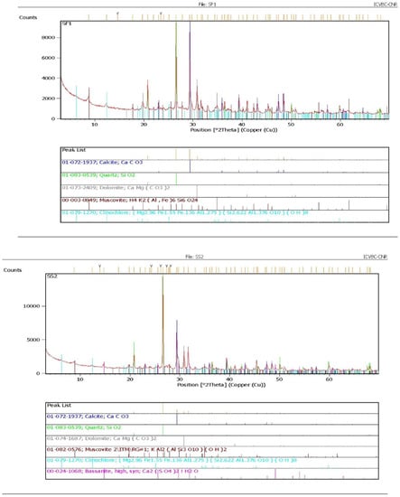 A mineralogical analysis of the studied sediment was carried out. As the sediment dredged from Safi harbor has the same origin, i.e., the erosion by sea of the neighboring dunes and beaches, the mineralogical composition is in principle the same in all the basins of the port. To confirm this hypothesis, two tests were carried out: first, one on the mixture of samples taken from P1, P2 and P3 (SF1), and a second one on the mixture of samples taken from P4, P5 and P6 (SS2). Quartz