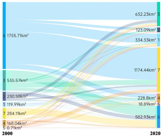 Change process of PEL space in Beijing from 2000 to 2020. (Note: taking an example, codes 1–7 represent urban living space to rural living space. The number on the left side of the figure represents the total area transferred from a certain land type to another).