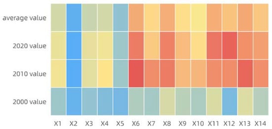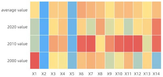 In terms of rural ecological space, among the average q values of rural ecological space differentiation in Beijing from 2000 to 2020, the top driving factors were X1 (DEM), X4 (temperature), X11 (total population), X14 (public financial expenditure), X12 (rural employees), as shown in Figure 7. As the natural background of rural ecological space, natural environmental factors ranked in the top three of the contribution values of digital elevation drivers from 2000 to 2020, highlighting the leading role of rural ecological space differentiation. In addition, the role of public financial expenditure drivers in the evolution of rural ecological space in Beijing has been strengthened, and the contribution value ranked second in 2020. It can be seen that the policy institutional environment has gradually become an important factor, leading to the evolution of rural ecological space along with high-quality economic development.