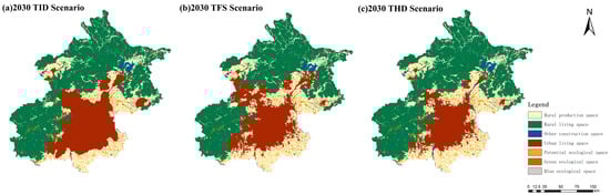 Based on the spatial evolution rules of Beijing’s land extracted from the model, restrictions such as food security and ecological priority were added to the urban and rural spatial simulation of Beijing in 2030, and the corresponding land spatial area data of three spatial development simulation scenarios were obtained, as shown in Table 8 and Figure 8. Under the inertial development scenario, the scale area of rural production space in Beijing will be 2980.80 km2 in 2030, the scale of rural living space is 833.61 km2, and the scale of rural ecological space is 8564.24 km2. Among them, green ecological space, blue ecological space, and potential ecological space account for 96%, 3%, and 1%, respectively. Compared with 2020, the area of rural production space and rural living space decreased significantly by 21.50% and 25.97%, respectively. The change in rural ecological space was small but also decreased by 2.20%. Under the scenario of food security, the scale of rural production space in Beijing will be 3798.04 km2 in 2030, the scale of rural living space is 827.87 km2 and the scale of rural ecological space is 7791.83 km2. Among them, green ecological space, blue ecological space, and potential ecological space account for 97%, 2%, and 1%, respectively. Compared with 2020, the rural production space basically maintains its volume, with a small increase of 0.96 km2. The goal of protecting arable land and ensuring food security has been achieved. Compared with the area of rural ecological space in 2020, the area of rural living space has decreased to a certain extent by 26.48% and 11.01%, respectively. Under the scenario of harmonious development, the scale area of rural production space in Beijing will be 3798.13 km2 in 2030, the scale of rural living space is 1008.67 km2 and the scale of rural ecological space is 8756.72 km2. Among them, green ecological space, blue ecological space, and potential ecological space account for 96%, 3%, and 1%, respectively. Compared with 2020, the rural production space basically maintains its volume, with a small increase of 1.05 km2. The area of rural living space has decreased by 117.41 km2 compared with 2020. The overall amount of rural ecological space remained stable, with a small increase of 0.2 km2. To sum up, the simulated urban and rural PEL space size and area in Beijing under different scenarios basically meet the target setting conditions, and the simulation effect is relatively ideal.