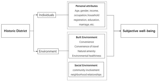 (3) Residents’ personal attributes: the historic district under analysis here is not only a residential area for local property owners, but also is populated by foreign households and tenants. Attributes of residents’ income, occupation, and education can create significant differences in individual subjective well-being. This paper also analyzes the comprehensive effects of these factors on the subjective well-being of residents in historic cultural districts (Figure 1).