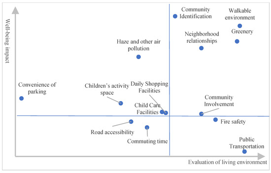 As shown in Figure 4, we divided satisfaction with the elements of the living environment and the analysis of the variability of the impact on subjective well-being into four-dimensional groups.
