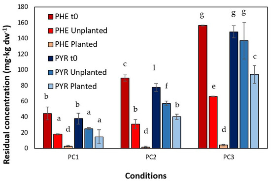 Residual pyrene (PYR) and phenanthrene (PHE) concentrations (mg each PAH kg−1) in the unplanted and planted soil, the latter being treated with 50 d phytoremediation by Cannabis sativa L. PYR t0 and PHE t0 represent the initial concentrations. The reported values are the means of three replicate analyses. The error bars display the RSD (residual standard deviations). The same letter represents no significant differences (p > 0.05) among total PAH removal after 50 days of phytoremediation.