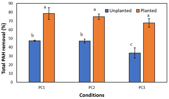 Total PAH removal (%) in the unplanted and planted conditions after 50 d of Cannabis sativa L.-induced phytoremediation. The reported values are the means of three replicate analyses. The error bars display the RSD (residual standard deviations). The same letter represents no significant differences (p > 0.05) among total PAH removal after 50 days of phytoremediation.